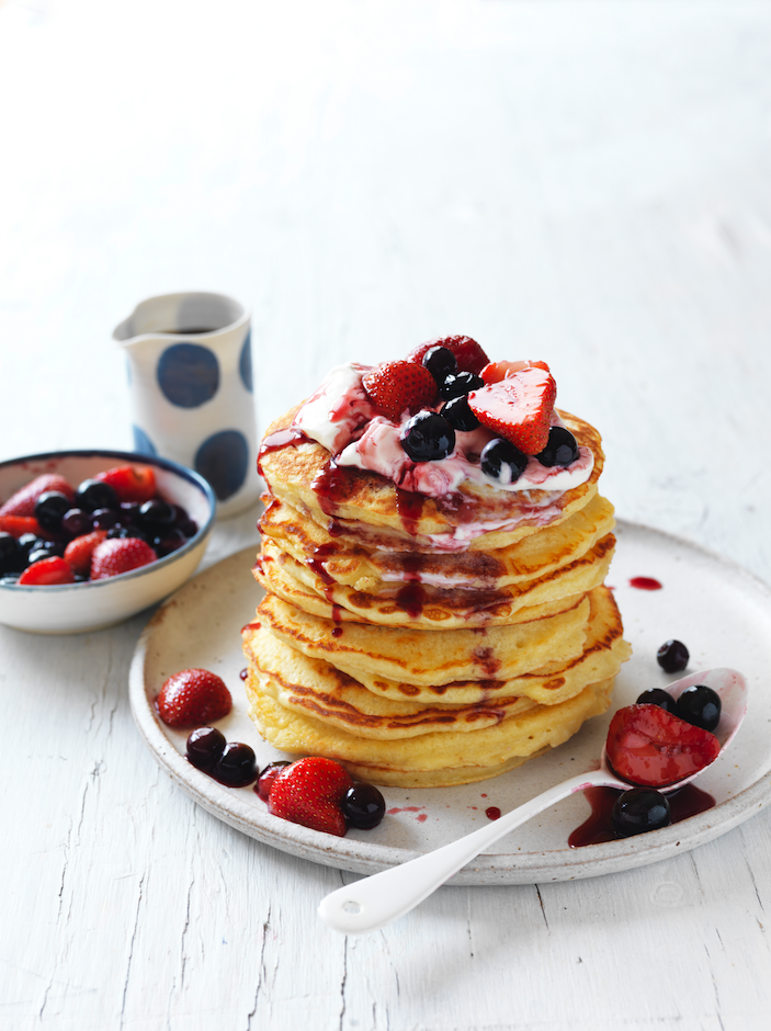 Poached berries with easy pancakes
