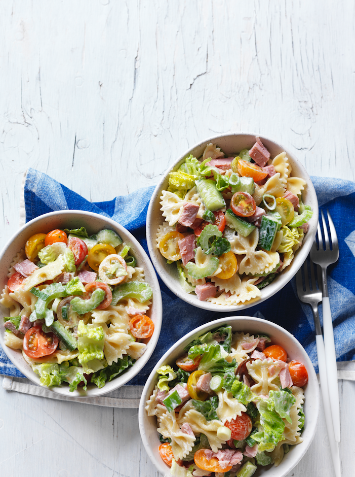 Tomato, cucumber & ham pasta salad