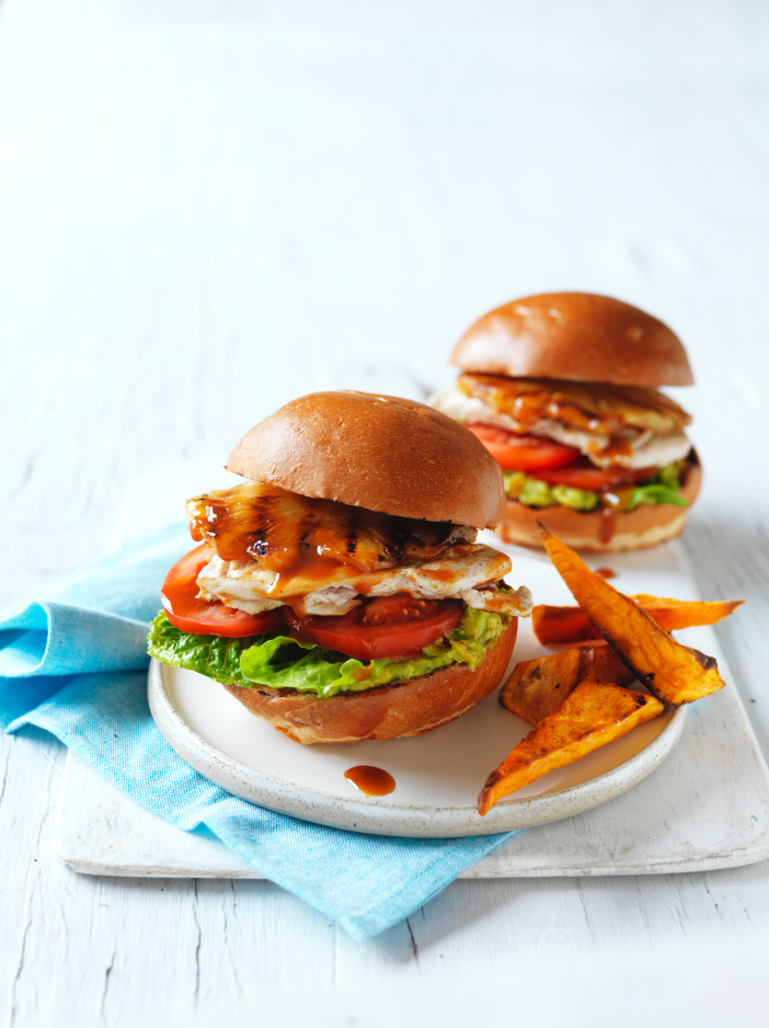 Peri peri chicken, pineapple, & avocado burgers
