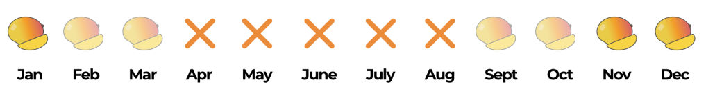 This mango has yellow-orange skin with a deep pink blush. It has sweet, juicy, firm flesh and small seed. It’s in season from September to March.