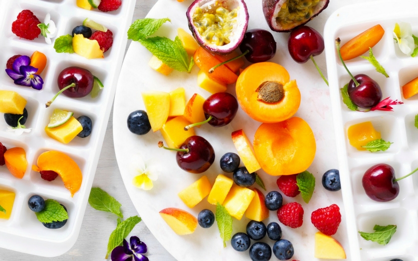 1. Place chopped fresh just-ripe fruit such as mango, apricot, peach and nectarine in deep ice-cube trays.