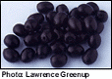 We are thin-skinned fruit, about 1.5-2cm long, egg-shaped and green with a shiny, oily appearance. If left to mature on the tree we turn dark purple to black. Inside we have a large, egg-shaped seed with pointed sharp ends. Our meaty flesh is inedible until properly pickled.