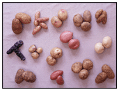 We're a close relative of tomatoes, you know, and capsicums and eggplants too. Our tubers are like washed river stones, rather smooth and rounded, varying in size and shape from round or oval to long and thin. We're covered in a fine, thin skin which encloses our soft, moist flesh. Our skin colour varies from creamy-to-white, yellow, red to even purple.