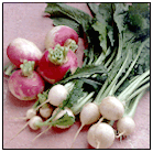 For a start we're a root vegetable related to radishes and mustards. We have a cylindrical, carrot or top-shape, with a flat top and a root which tapers to a point. Our skin is almost smooth and can be green, or white with green or purple bands at the top. Our leaves can be eaten as a leafy vegetable. Our flesh colour is white or yellow with a delicious, tender and sweet flavour.